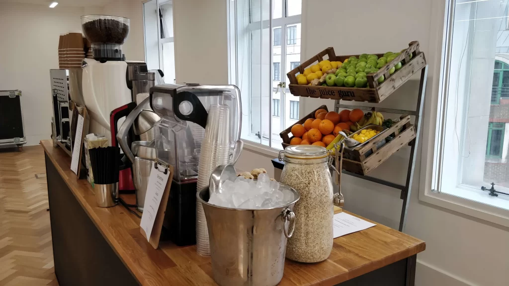 We offer personalised smoothie bars that showcase your brand at your stand. When choosing our unique smoothie bar, please consider the venue size and the number of guests you plan to serve, as each of our setups is tailored to meet different client needs.